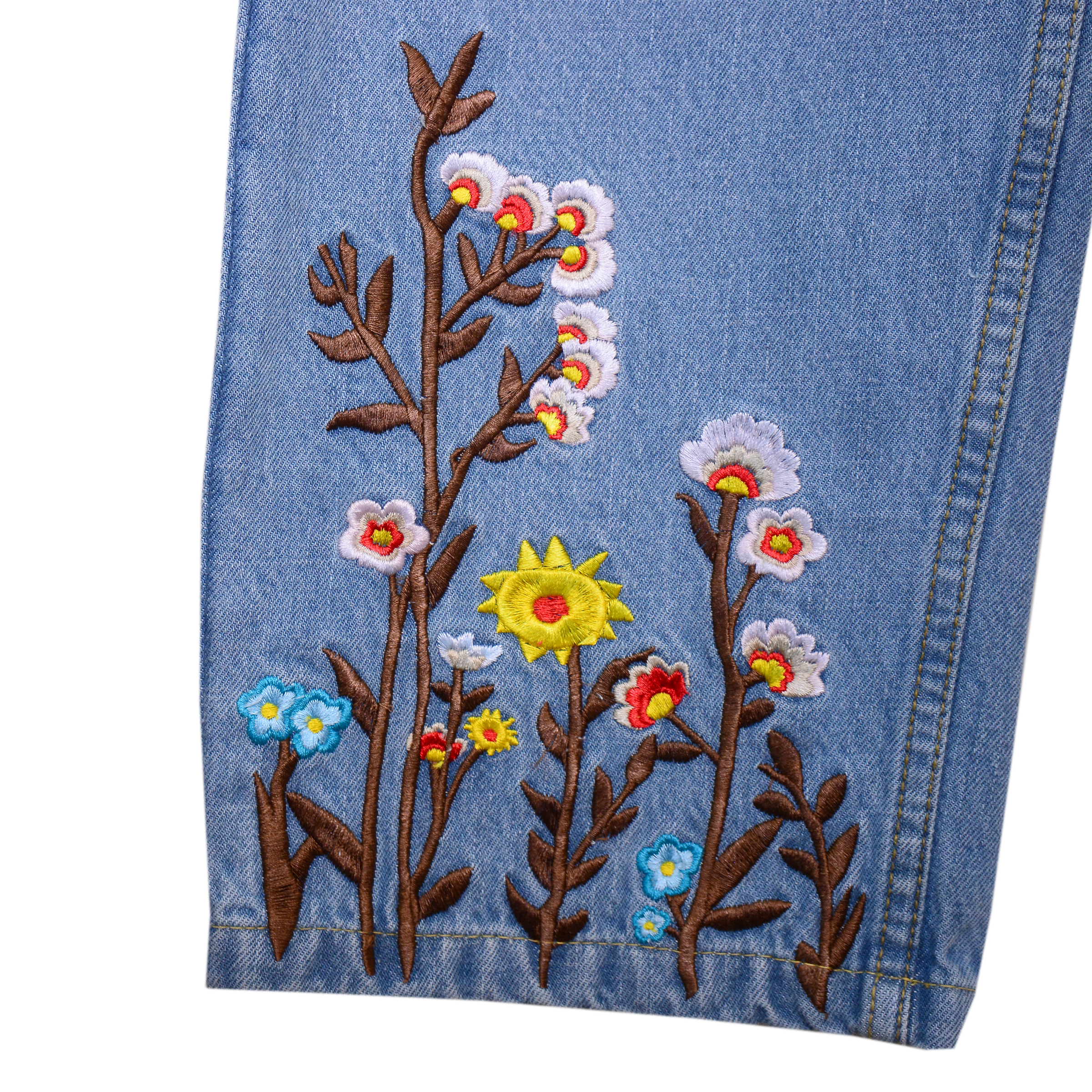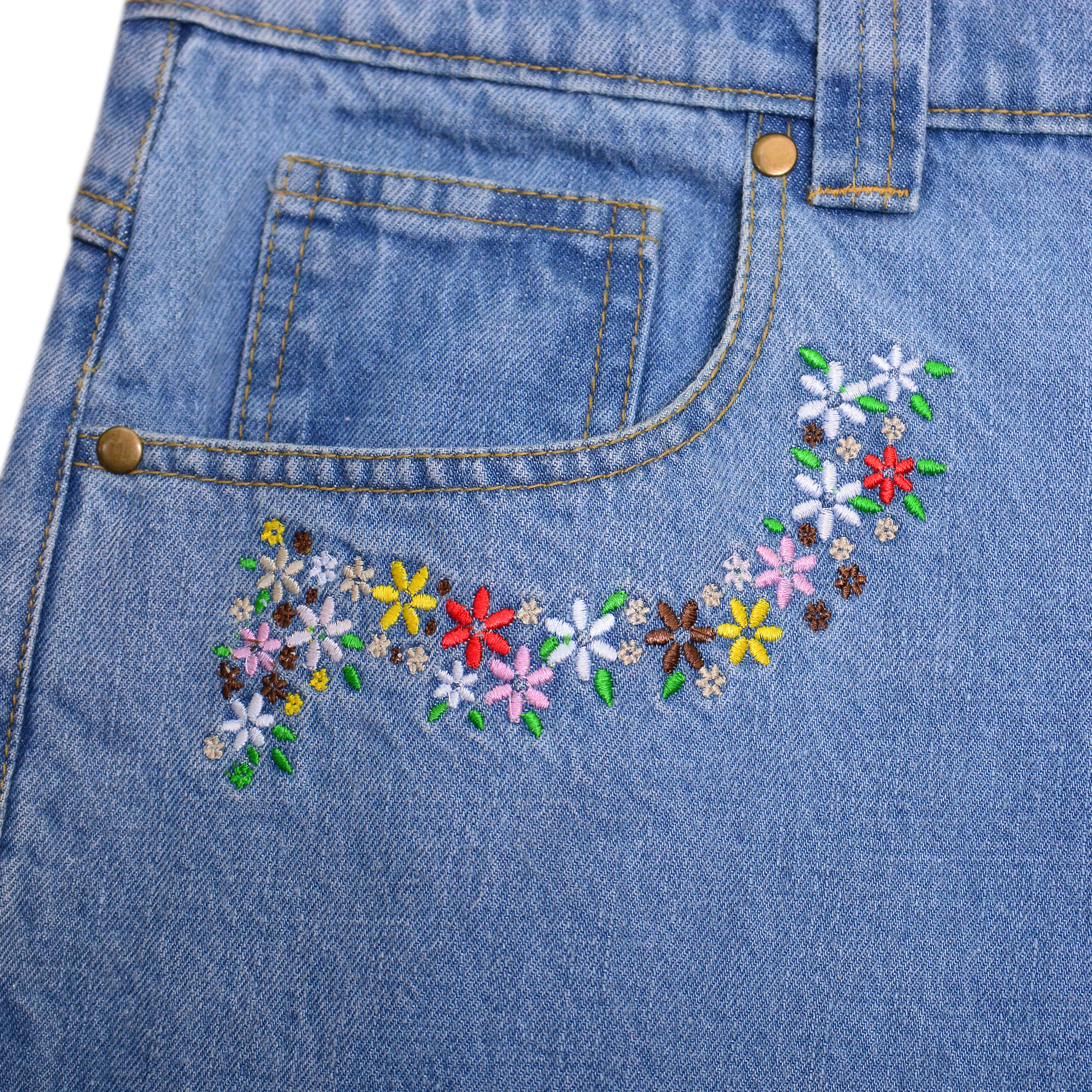 To maintain their quality, store folded or hung in a cool, dry place. Gentle machine wash inside out is recommended to preserve the embroidery and denim finish.